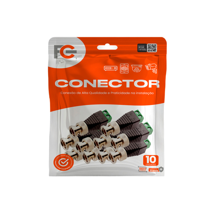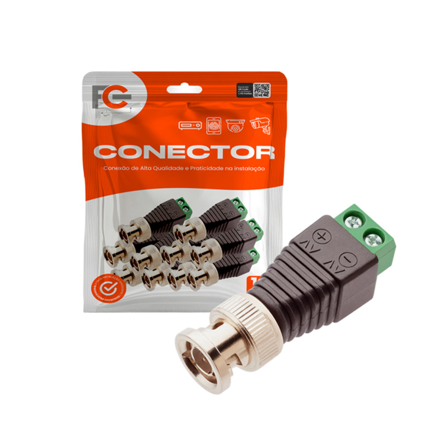 Usado para ligar câmeras de segurança CFTV através de cabo de rede UTP categoria 5e ou 6. Produto com excelente qualidade profissional e de fácil instalação. O Conector BNC é o mais usado para instalação de câmeras. Não precisa soldar, pois ele tem parafusos que facilitam a fixação do cabo.