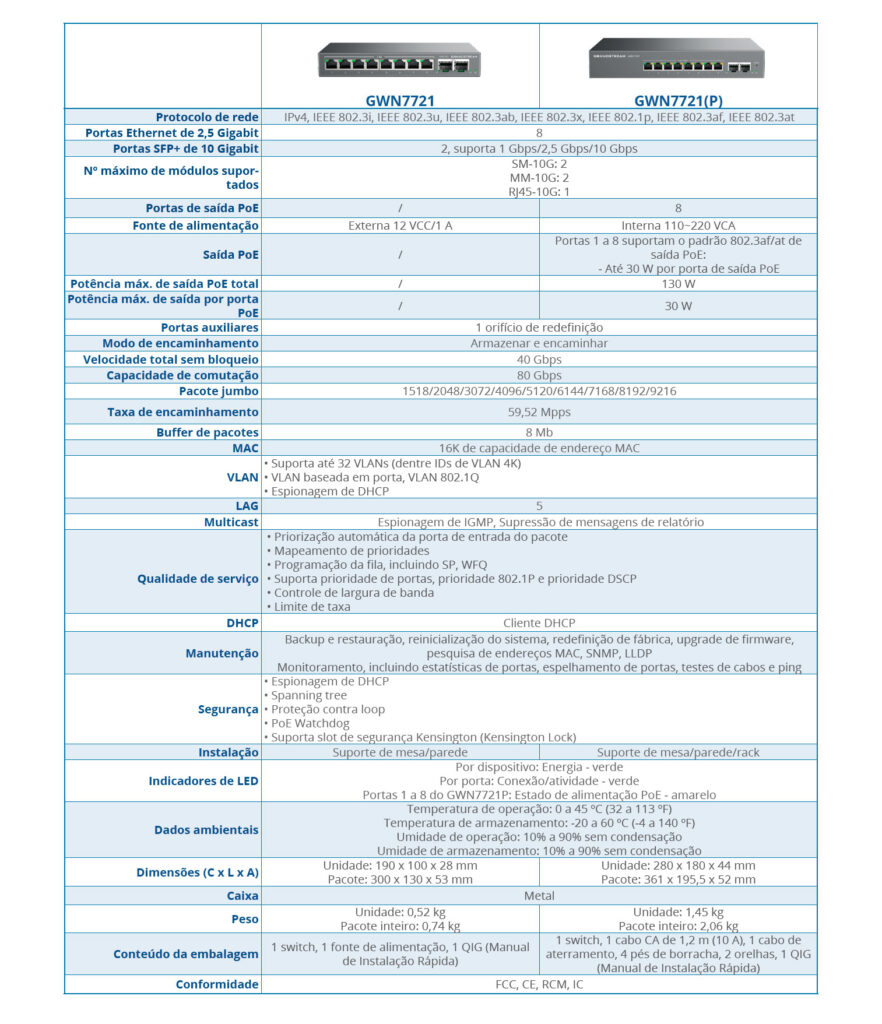 SWITCH 8 PORTAS 2.5GE POE + 2 PORTAS SFP+10G GERENCIÁVEL LAYER 2 LITE (GWN7721P)